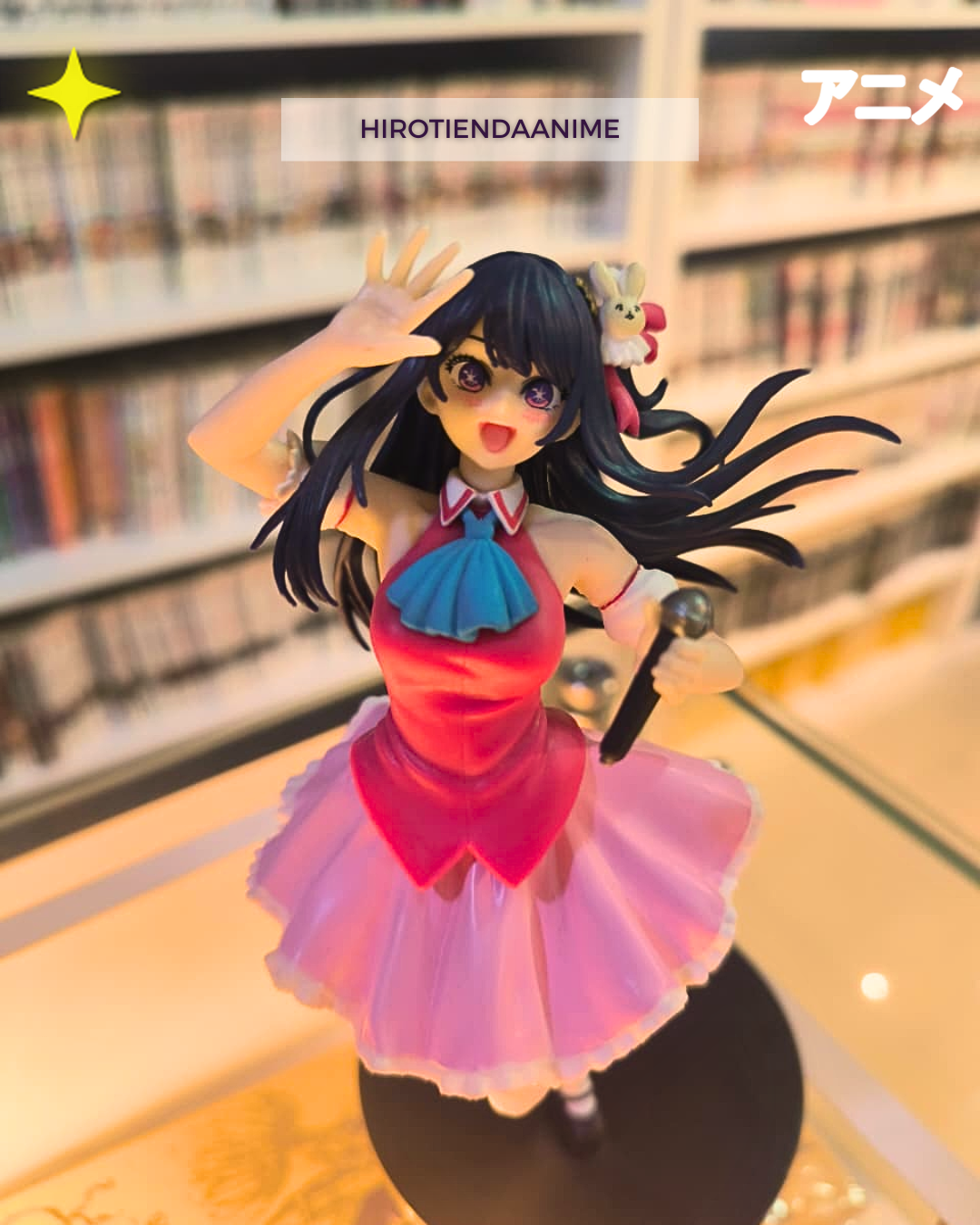 Esta figura captura a Ai en todo su esplendor, con su icónico cabello azul oscuro brillando y su inconfundible ojo estrellado que hipnotiza a todos los que la miran. Ataviada con un atuendo de ídolo que combina un top rosa vibrante con un diseño de volantes y una falda plisada en tonos más claros, irradia energía y encanto.