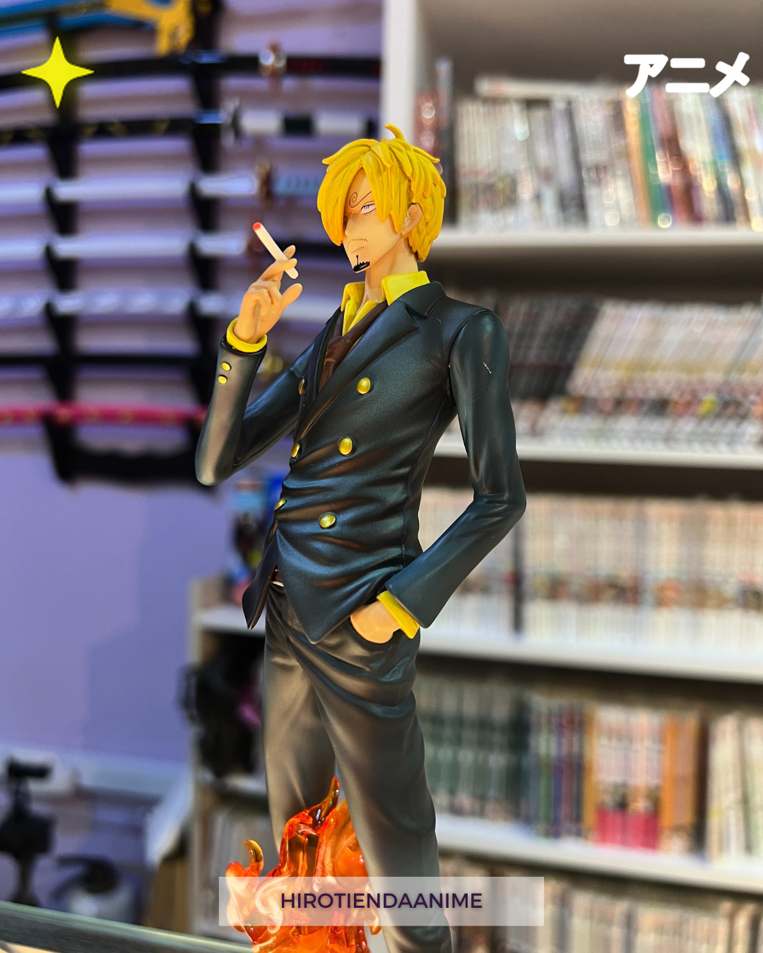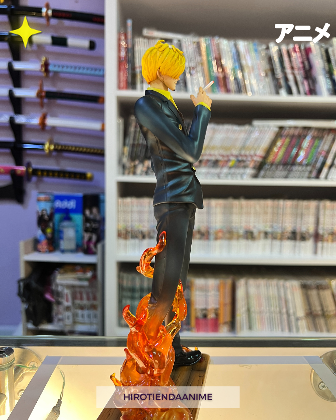 La figura incluye un espectacular efecto de llamas en los pies, representando su poderoso Diable Jambe, con un acabado translúcido y tonos intensos que le dan un toque dinámico y lleno de energía. Su traje detallado, colores vibrantes y expresión precisa hacen de esta figura una pieza imprescindible para cualquier fan de la serie.
