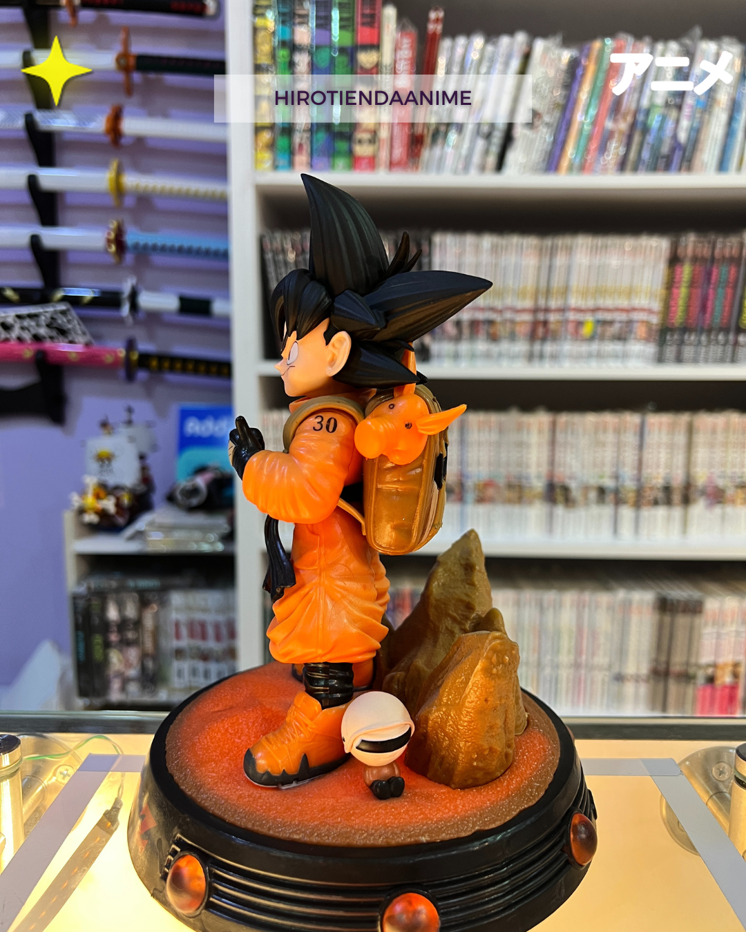 - Diseño Aventurero: Goku niño con mochila, listo para nuevas exploraciones.