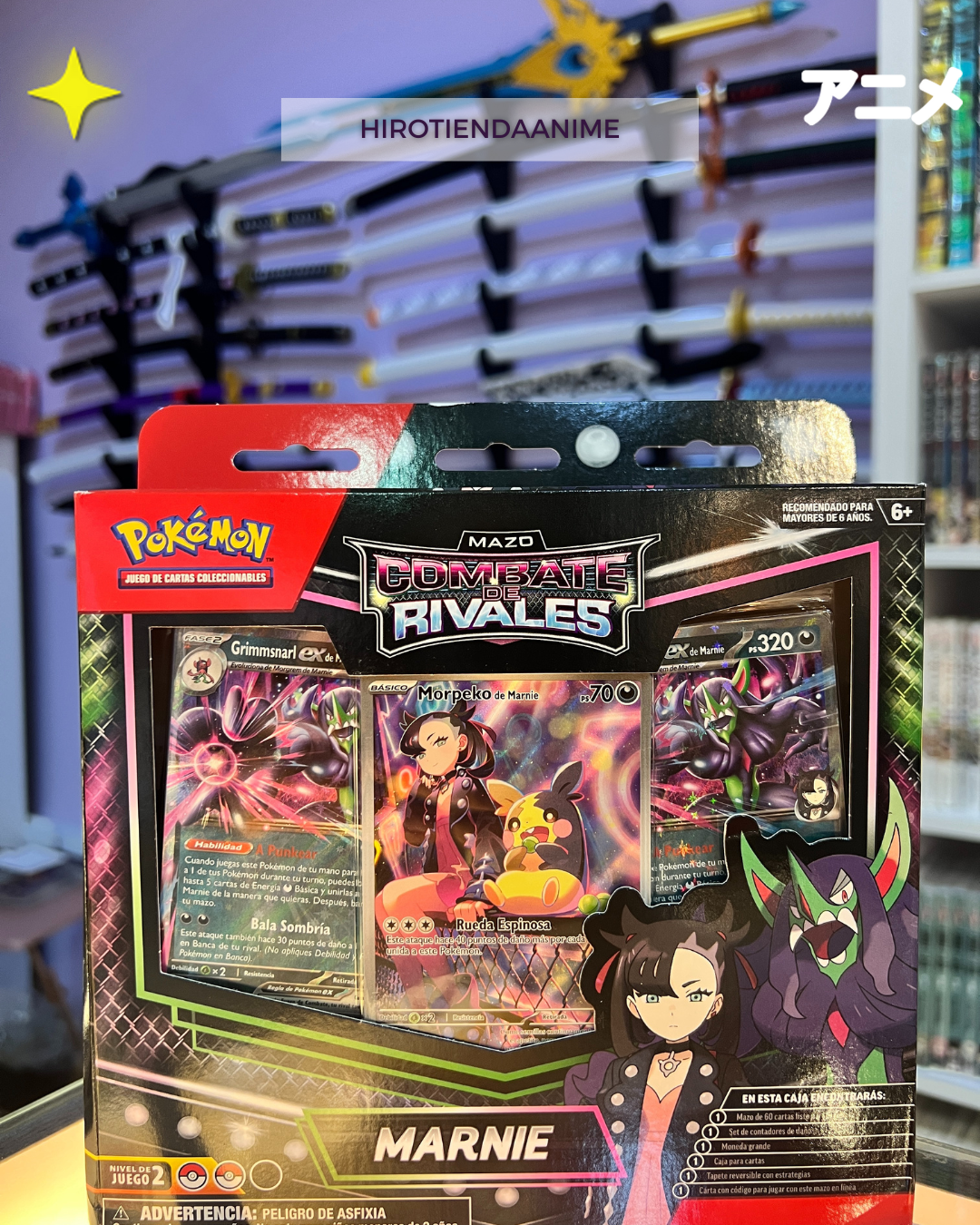 • Cartas Destacadas: Incluye cartas holográficas del Pokémon ex principal y cartas de Entrenador temáticas (como Marnie o Steven, según el mazo).