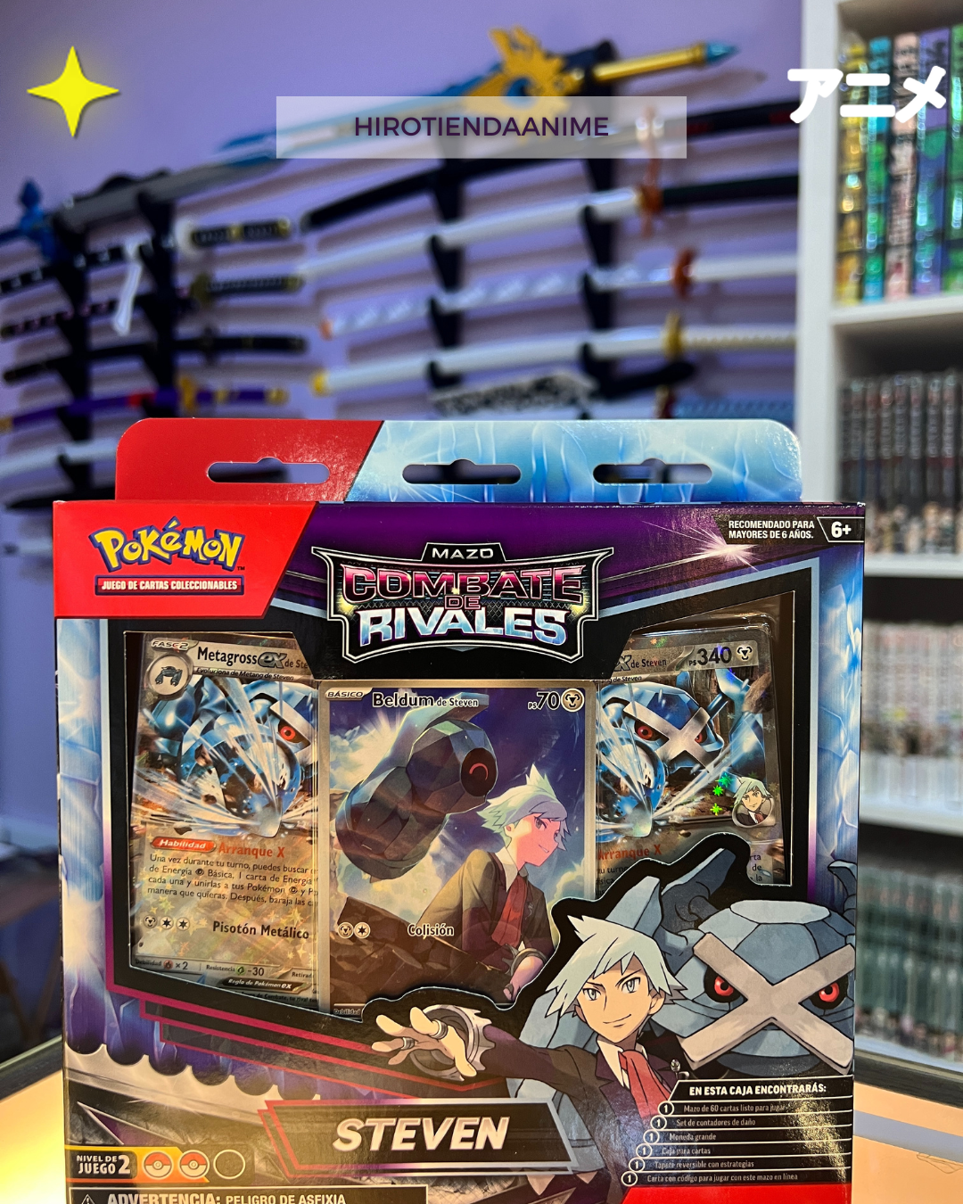 • Contenido: Cada caja incluye una baraja completa de 60 cartas lista para jugar, centrada en el Pokémon ex principal, contadores de daño, una moneda, una caja para baraja, un tapete de juego y una guía de reglas rápida.