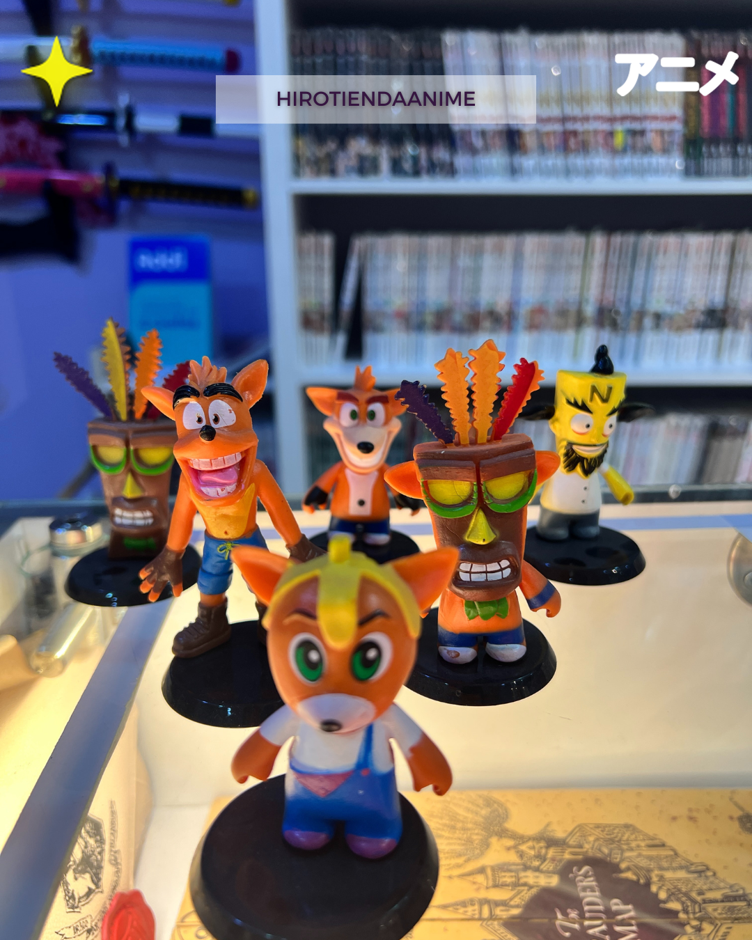 ¡Prepárate para girar y saltar con este fantástico set de figuras estilo chibi de Crash Bandicoot! Este dinámico conjunto trae a la vida a los personajes más queridos del clásico videojuego de plataformas, listos para tu colección.