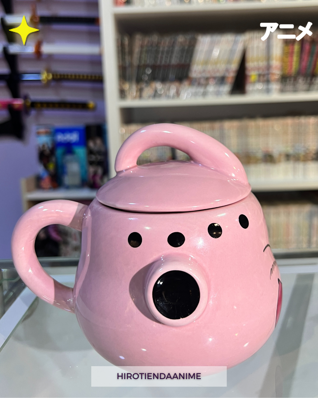 Con su icónico color rosa y la antena de su cabeza que sirve como asa de la tapa, esta pieza es un must-have para cualquier fan de DBZ. La tapa ayuda a mantener tus bebidas calientes… ¡o a guardar tus dulces favoritos, antes de que Buu los convierta en chocolate!